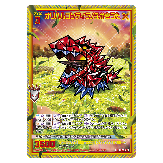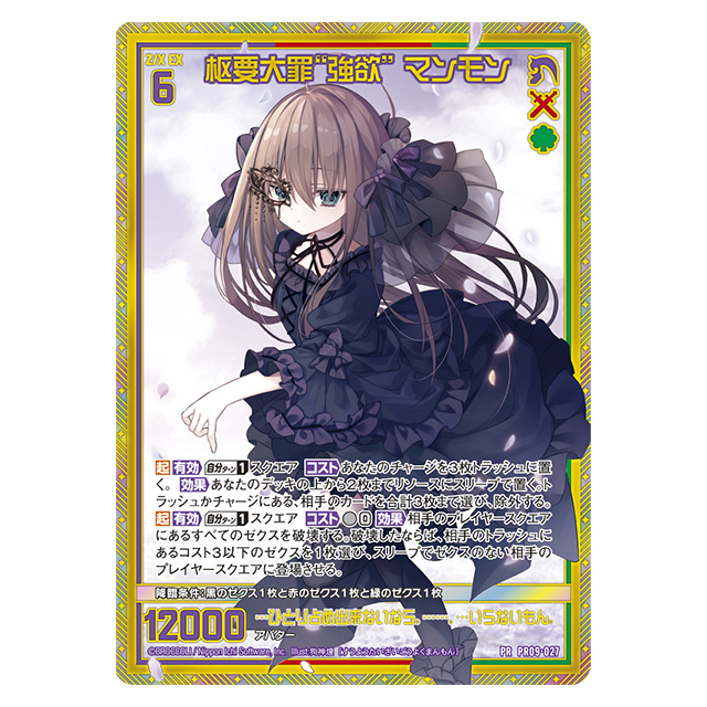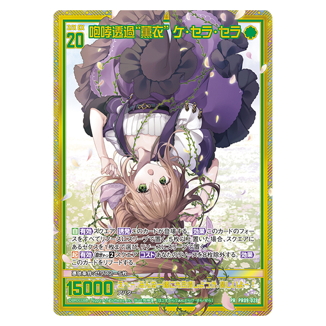 | 付属card | ホロ+金箔仕様 (各1枚) ✅PR09-023「【剣誓『戦車』】世羅」 ✅PR09-024「セーラ“火焔転身”オリハルコンティラノ」 ✅PR09-025「数理妖精“知音” パピス」 ✅PR09-026「四大天聖“風” セラフィム」 ✅PR09-027「枢要大罪“強欲” マンモン」 ✅PR09-028「咆哮透過“薫衣” ケ・セラ・セラ」 ✅PR09-029「オリハルコンティラノえかきうた」 ノーマル仕様 (1枚) ✅PR09-030「倉敷世羅」 |